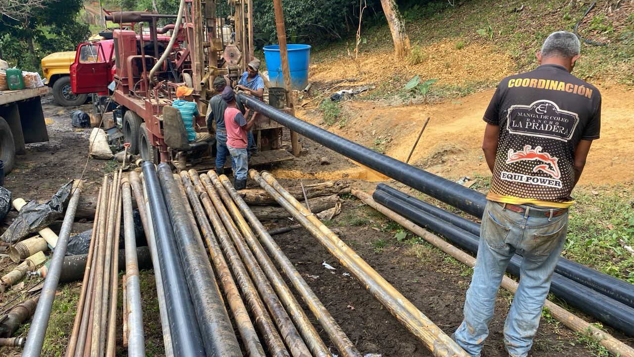 Las labores iniciaron con la perforación de 80 metros de profundidad, durante este proceso, se ha utilizado maquinaria pesada y la precisión de la torre grúa, se realizó el lavado con compresor de aire, una técnica que limpia el lodo y prepara el terreno para que brote el agua limpia.